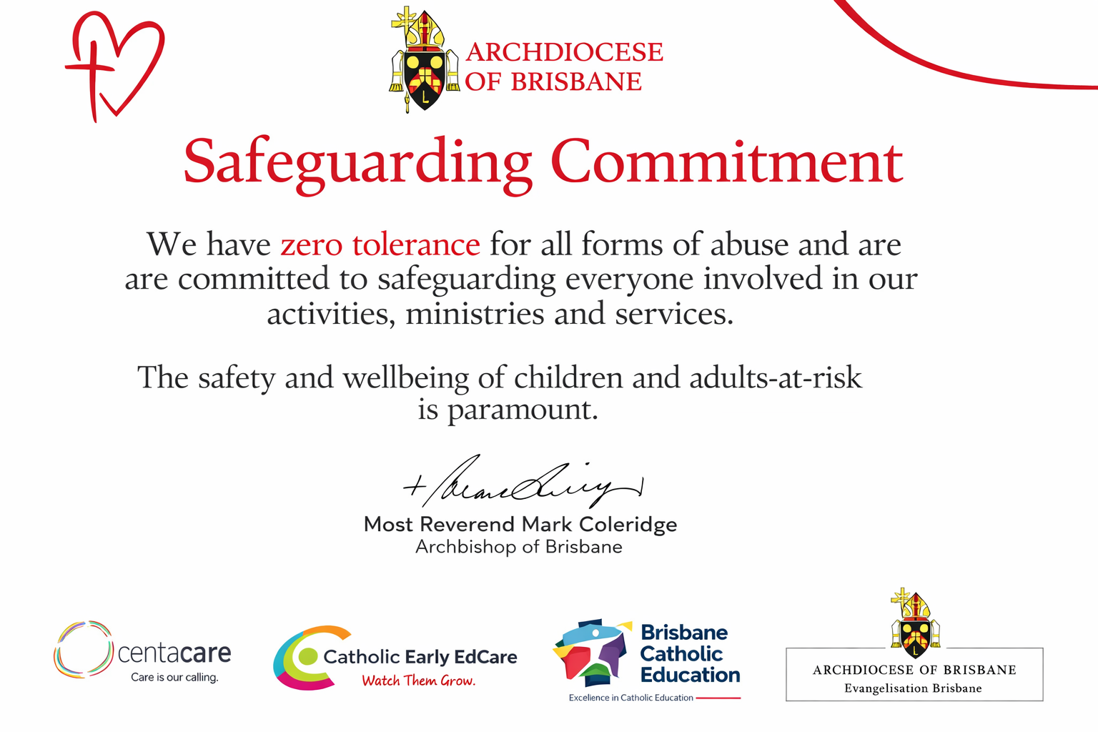 The Archdiocese of Brisbane holds that children, young people and vulnerable adults are a gift from God with an intrinsic right to dignity of life, respect and security from physical and emotional harm.